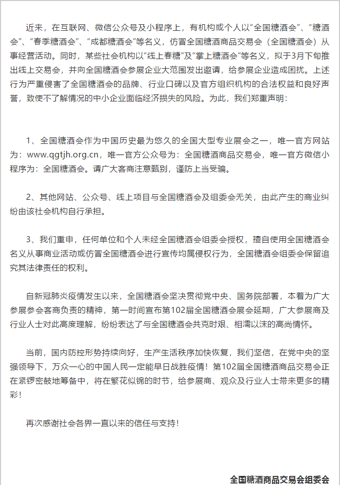 根據(jù)糖酒會設計搭建公司領(lǐng)藝展覽從糖酒會組委會官網(wǎng)了解到,近來,在互聯(lián)網(wǎng)、微信公眾號及小程序上,有機構(gòu)或個人以“全國糖酒會”、“糖酒會”、“春季糖酒會”、“成都糖酒會”等名義,仿冒全國糖酒商品交易會(全國糖酒會)從事經(jīng)營活動。同時,某些社會機構(gòu)以“線上春糖”及“掌上糖酒會”等名義,擬于3月下旬推出線上交易會,并向全國糖酒會參展企業(yè)大范圍發(fā)出邀請,給參展企業(yè)造成困擾。上述行為嚴重侵害了全國糖酒會的品牌、行業(yè)口碑以及官方組織機構(gòu)的合法權(quán)益和良好聲譽,致使不了解情況的中小企業(yè)面臨經(jīng)濟損失的風險。